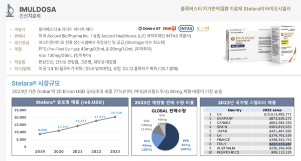 이뮬도사는 얀센이 개발한 '스텔라라(성분명 우스테키누맙)'의 바이오시밀러로 판상 건선과 건선성 관절염, 크론병 및 궤양성 대장염과 같은 염증성 질환 치료제다.